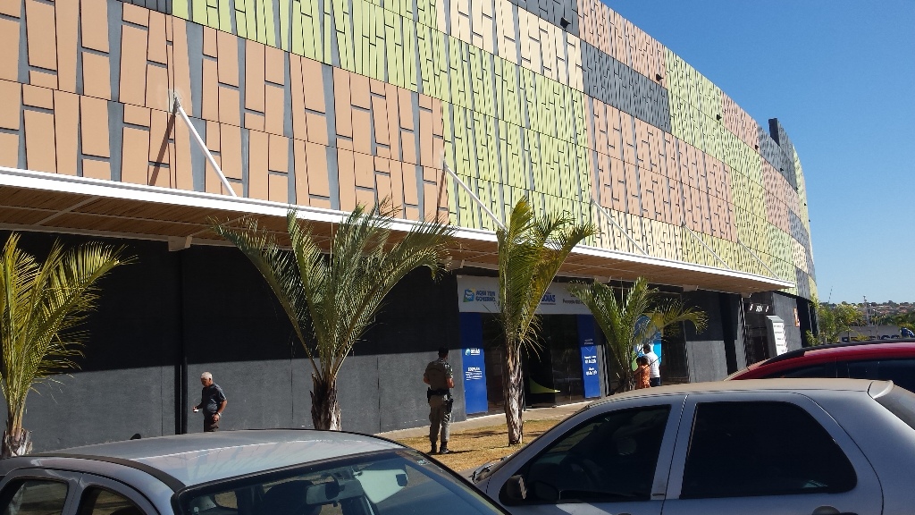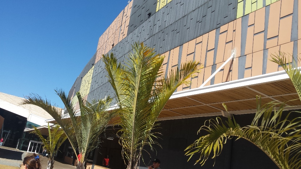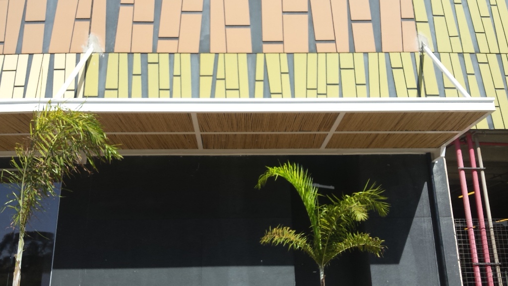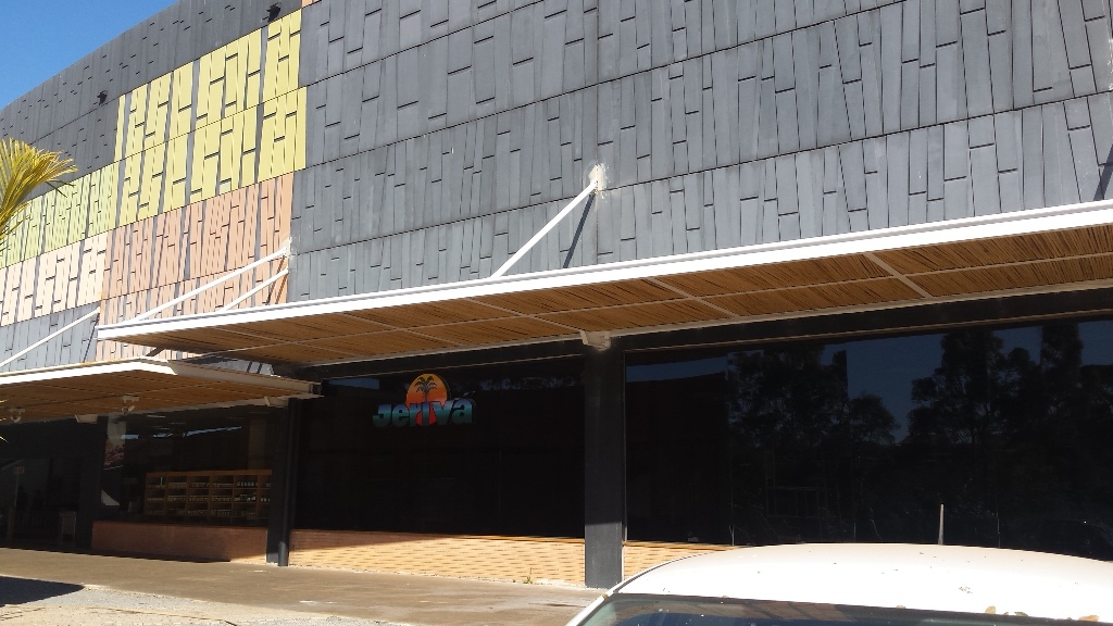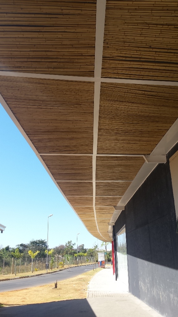 Cobertura em estrutura e telha metálica com forro em bambu, no Passeio da Águas Shopping.